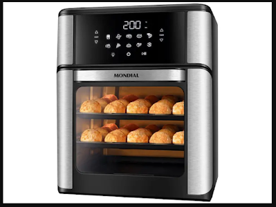 A fritadeira elétrica sem óleo/Air Fryer Mondial Forno Oven AFON-12L-BI é 2 em 1, pois alia as vantagens da tecnologia da Air Fryer ao espaço e versatilidade do forno. Você pode assar, cozinhar e fritar sem óleo. Nas cores preto e inox, ela é fabricada com PP e inox, possui cesto com capacidade de 5L. Ainda tem, 3 assadeiras. Conta com antiaderente Duraflon, onde os alimentos não grudam no fundo. Painel digital com 10 funções predefinidas. Tecnologia de circulação de ar quente: equipada com tecnologia que aquece e circula o ar. O ar superquente envolve e cozinha o alimento, sem a necessidade de usar óleo. Porta com amplo visor + iluminação interna para visualizar as receitas durante o preparo. Acompanha 1 Luva de Silicone e 1 Livro de Receitas.