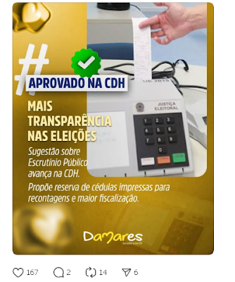 Graças ao apoio de mais de 20 mil cidadãos no Portal e-Cidadania, a Ideia Legislativa nº 146383 (“Aplicar publicidade do escrutínio impressos ou em cédulas”) foi transformada Projeto de Lei e começou agora a tramitar no Senado Federal.