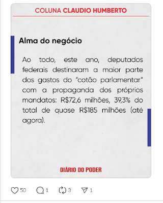 A propaganda é a alma do negócio, e o “negócio” é o próprio mandato. Deputados gastam milhões com autopromoção, mas chamam de “divulgação parlamentar.#política #poder #brasil