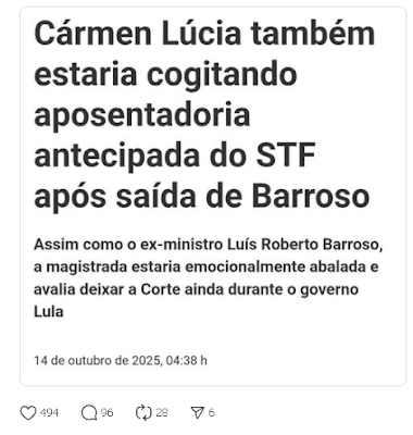 Posted inUncategorized RS Notícias: Carmen Lúcia quer se aposentar no STF: Entenda os rumores sobre a possível saída da ministra Posted by rsnotici October 16, 2025No Comments O que está fazendo os ministros do Supremo abandonarem um dos cargos mais poderosos do país? 🤔 Postagem de Leandro Ruschel Fonte: https://www.threads.com/@leandroruschel/post/DPzSkQ5kZ4U?xmt=AQF00MBrrK8igddD6uuRZixj-m2YnNdf-ZVdQ_op7YMh9Q&slof=1 Source: RS Notícias: Carmen Lúcia quer se aposentar no STF: Entenda os rumores sobre a possível saída da ministra rsnotici View All Posts Post navigation Previous Post RS Notícias: Senador Magno Malta põe Barroso à prova: ‘Não adianta chorar, Perdeu Mané. Vai tomar Magnitisky’Next PostRS Notícias: Apple TV+ muda de nome: Novidades no serviço de streaming da Apple