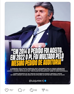 PERSEGUIÇÃO EXPOSTA!Fux desmascara MoraesA lembrança feita por Fux contrasta com o tratamento dado ao pedido apresentado pelo Partido Liberal (PL) em 2022, depois do segundo turno das eleições presidenciais. À época, a legenda protocolou uma “verificação extraordinária” sobre as urnas eletrônicas,O então presidente do TSE, ministro Alexandre de Moraes, indeferiu o pedido de forma liminar e aplicou multa de R$ 22 milhões ao partido por litigância de má-fé.