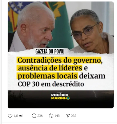 Enquanto o Brasil afunda em violência, impostos e dívidas, Lula faz da COP30 um circo ideológico. Um governo que não entrega resultado em casa não tem moral para discursar ao mundo. É hipocrisia verde com fundo vermelho! #PadrãoPT