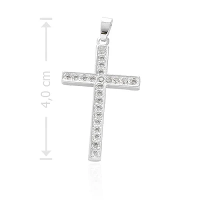 Crucifixo folheado a prata, contendo micro zircônias cravejadas em toda sua extensão.