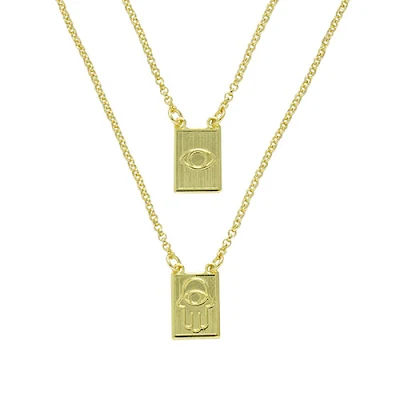 Gargantilha escapulário folheada a ouro, contendo medalhas de Mão de Fátima e Olho Grego.