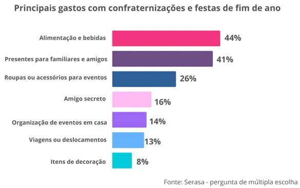 O controle de custos aparece com mais força neste fim de ano, já que 54% pretendem gastar menos do que em 2024 com confraternizações. Entre os motivos mais citados estão o desejo de destinar mais recursos para o pagamento de dívidas (39%) e o fato de já estarem com débitos acumulados (22%).