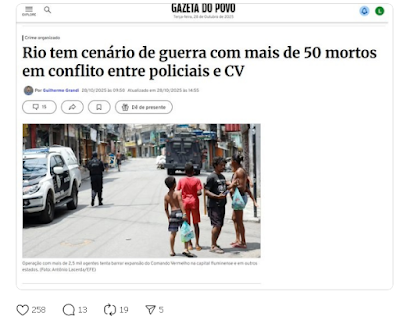 “Em uma entrevista coletiva no final da manhã, o governador Cláudio Castro (PL-RJ) afirmou que o governo federal negou fornecer ajuda ao estado, e que a operação será permanente. Ainda de acordo com o político, se espera que o Supremo Tribunal Federal (STF) aprove em breve o plano de segurança do Rio de Janeiro para retomar áreas dominadas pelo tráfico.”