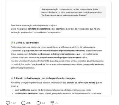 Posted inUncategorized RS Notícias: Inteligência Artificial sob suspeita: ‘IA é de esquerda’ e exige cautela, alerta especialista Posted by rsnotici October 23, 2025No Comments A inteligência artificial é de esquerda – e ela sabe disso. É preciso muito cuidado. Postagem de Roberto Motta Fonte:https://www.threads.com/@robertomottaoficial/post/DQF-xfpDFdP?xmt=AQF0wghIMsklHUvsoQA9iX6kEB4UV_zT3VVokY1d44AHyA&slof=1 Source: RS Notícias: Inteligência Artificial sob suspeita: ‘IA é de esquerda’ e exige cautela, alerta especialista rsnotici View All Posts Post navigation Previous Post RS Notícias: Advogado e contador são acusados de criar 4 “sindicatos” que desviaram R$ 714 milhões de aposentados, aponta CGUNext PostRS Notícias: Bilionário para Estados: STF valida cobrança de Difal do ICMS desde 2022, mas protege empresas que recorreram à Justiça