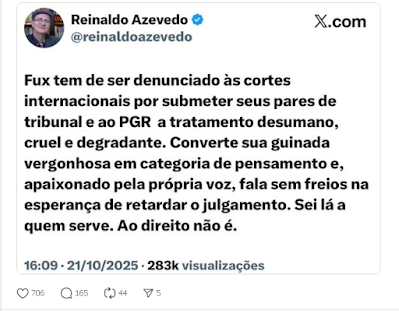 Numa inversão moral completa, os militantes de redação, colaboracionistas do regime, estão condenando Fux por expor a ditadura brasileira, e não os responsáveis pela destruição do Estado de Direito.