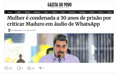 Origem: RS Notícias: Mulher é condenada a 30 anos de prisão por criticar Maduro em áudio de WhatsApp