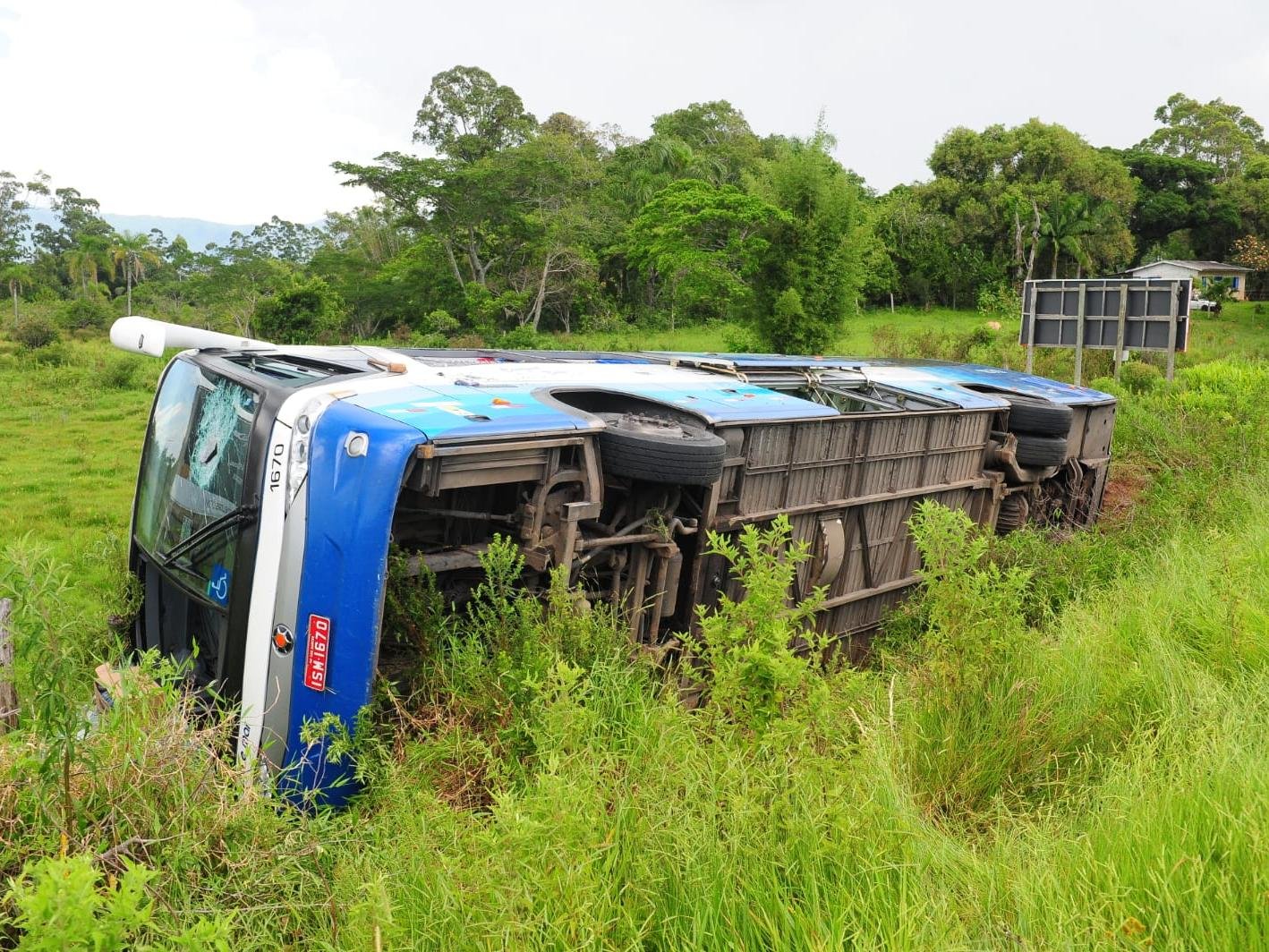 • O motorista perdeu o controle da direção, saiu da pista e o ônibus tombou às margens da rodovia.