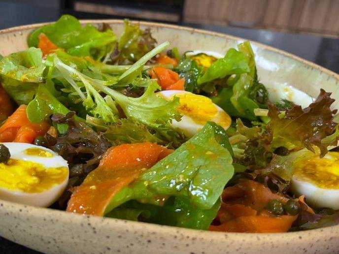 - Montagem: Distribua as folhas secas em uma saladeira. Adicione os ovos cozidos, as alcaparras, as tiras de salmão defumado e a cebolinha tostada.