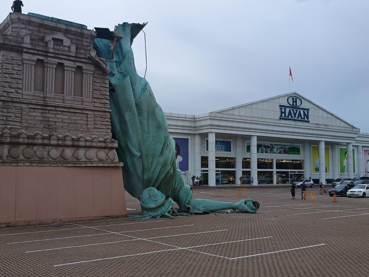 Origem: RS Notícias: Réplica da Estátua da Liberdade da Havan cai durante temporal em Guaíba