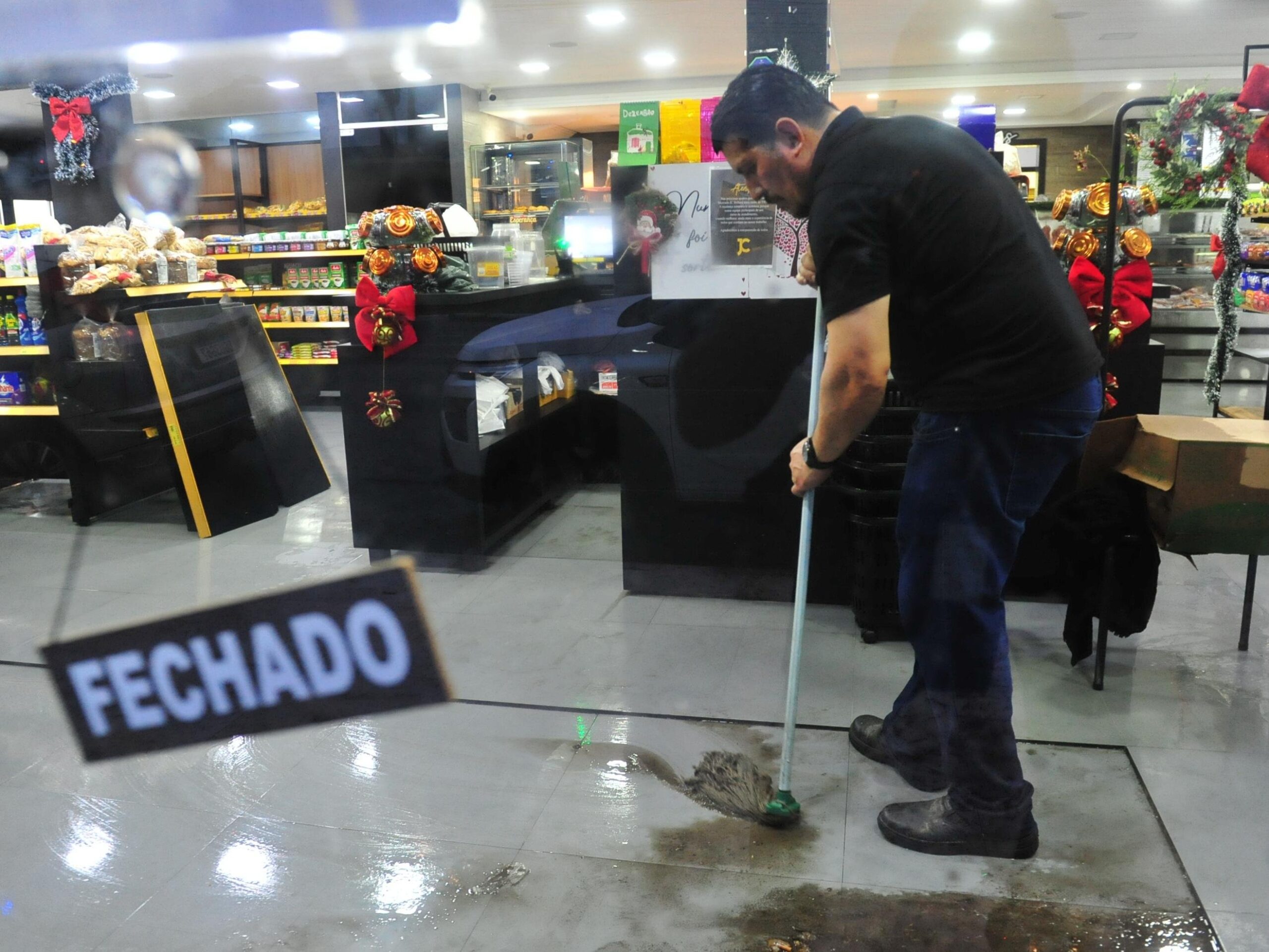 - Anderson Wust, proprietário de uma loja de bebidas próxima, também teve o estabelecimento invadido pela água. Ele conseguiu retirar o carro e proteger parte dos produtos, mas relata que o local ficou alagado por cerca de 30 minutos.