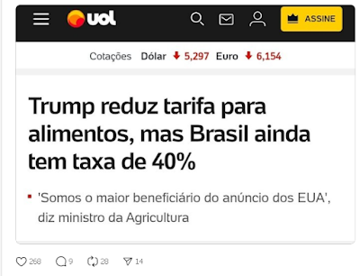 Foi patética a reação dos ministros do Descondenado ao comemorarem a redução das tarifas globais dos EUA para carne, café e alguns outros produtos, para na sequência descobrirem que a redução foi de 50% para 40% para o Brasil.Alguns já corriam para tentar capitalizar politicamente o episódio, vendendo-o como uma “vitória da diplomacia brasileira” — quando, na realidade, trata-se de uma medida aplicada a todos os países, motivada exclusivamente pelas pressões inflacionárias internas nos EUA.